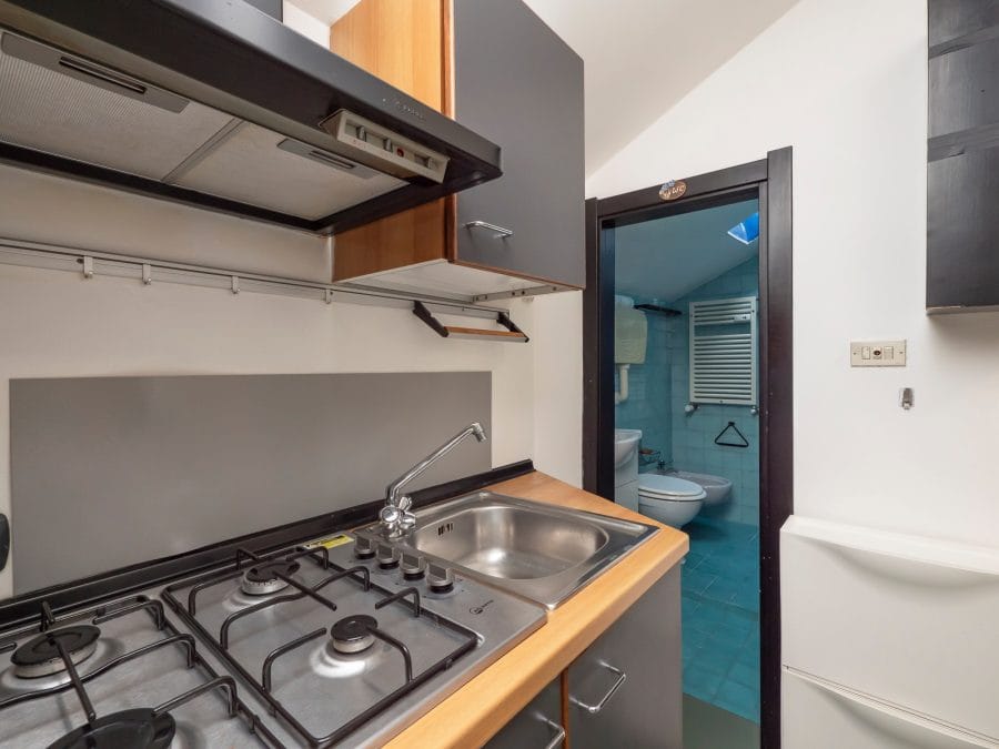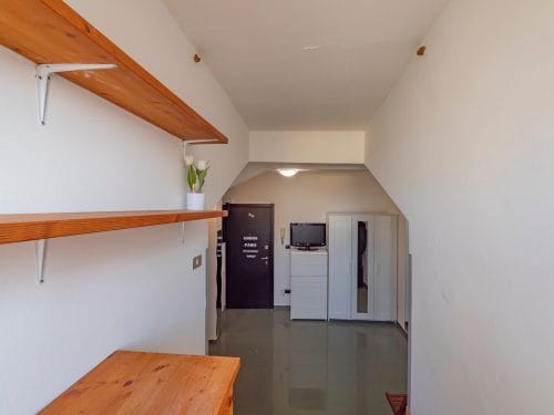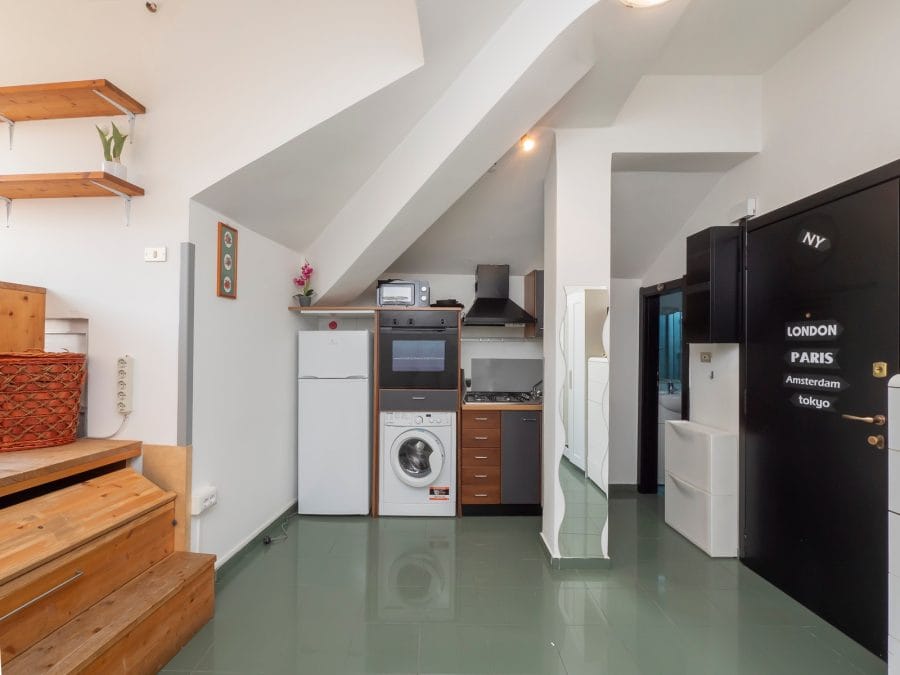 Il monolocale è funzionale e dotato di elettrodomestici. E’ composto da un unico spazio: zona cucina, due gradini per accedere a un piccolo soppalco con zona studio dov’è presente una scrivania con sedia e una finestra che permette l’entrata di moltissima luce naturale. C’è una zona antibagno e infine il bagno con la doccia.