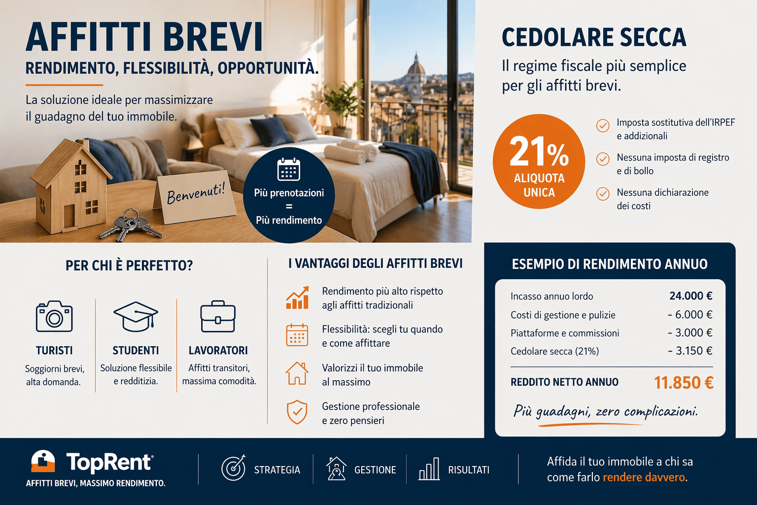 Ed è qui che entra in gioco la gestione professionale che si limita a ottimizzare le prenotazioni o a migliorare l’occupazione. Lavora anche su tutto ciò che incide sul risultato finale: costi, struttura operativa e, di conseguenza, fiscalità. Capire quale regime fiscale adottare non è un passaggio separato. È parte della strategia con cui si costruisce il rendimento.